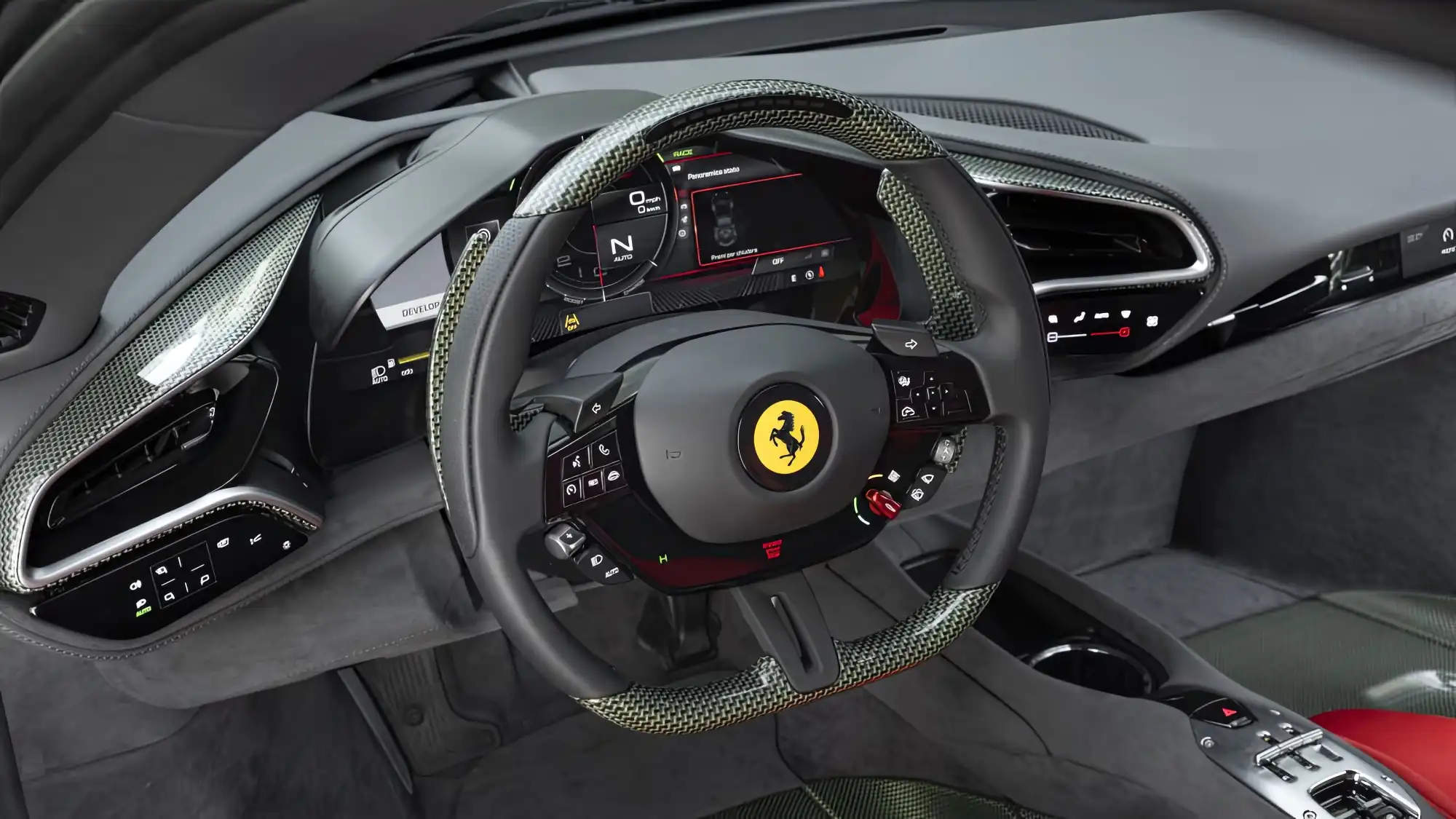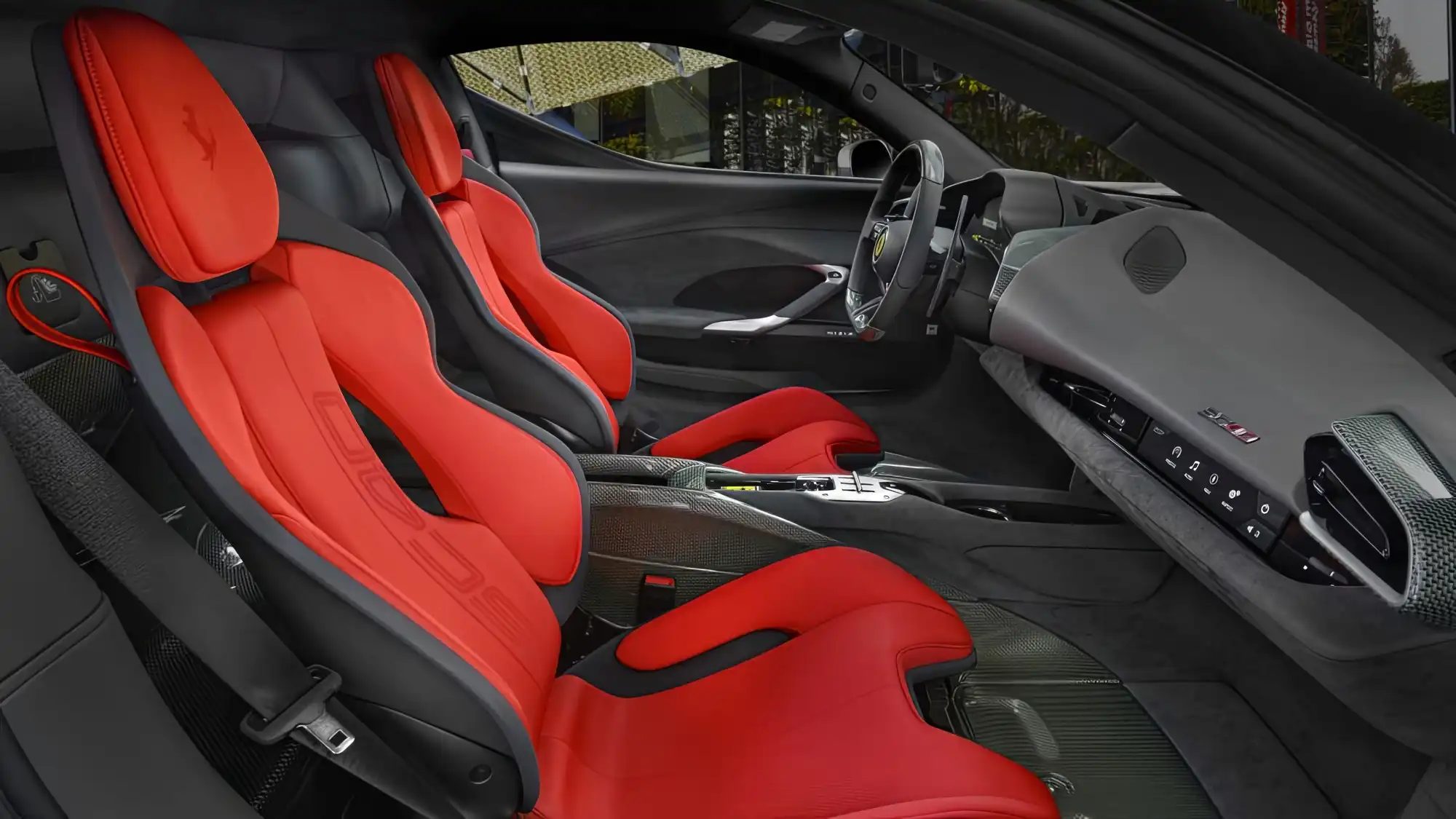 Интерьер выполнен в стилистике Ferrari 296 GTB, претерпев лишь косметические изменения. Карбоновая отделка подчеркивает преемственность традиций Ferrari F40, славившегося активным использованием композитов. Салон отделан сочетанием черной алькантары и красных тканей, примененных внутри сидений. Штампованная эмблема с конём размещена на подголовниках, а панели приборов украшены значком SC40.