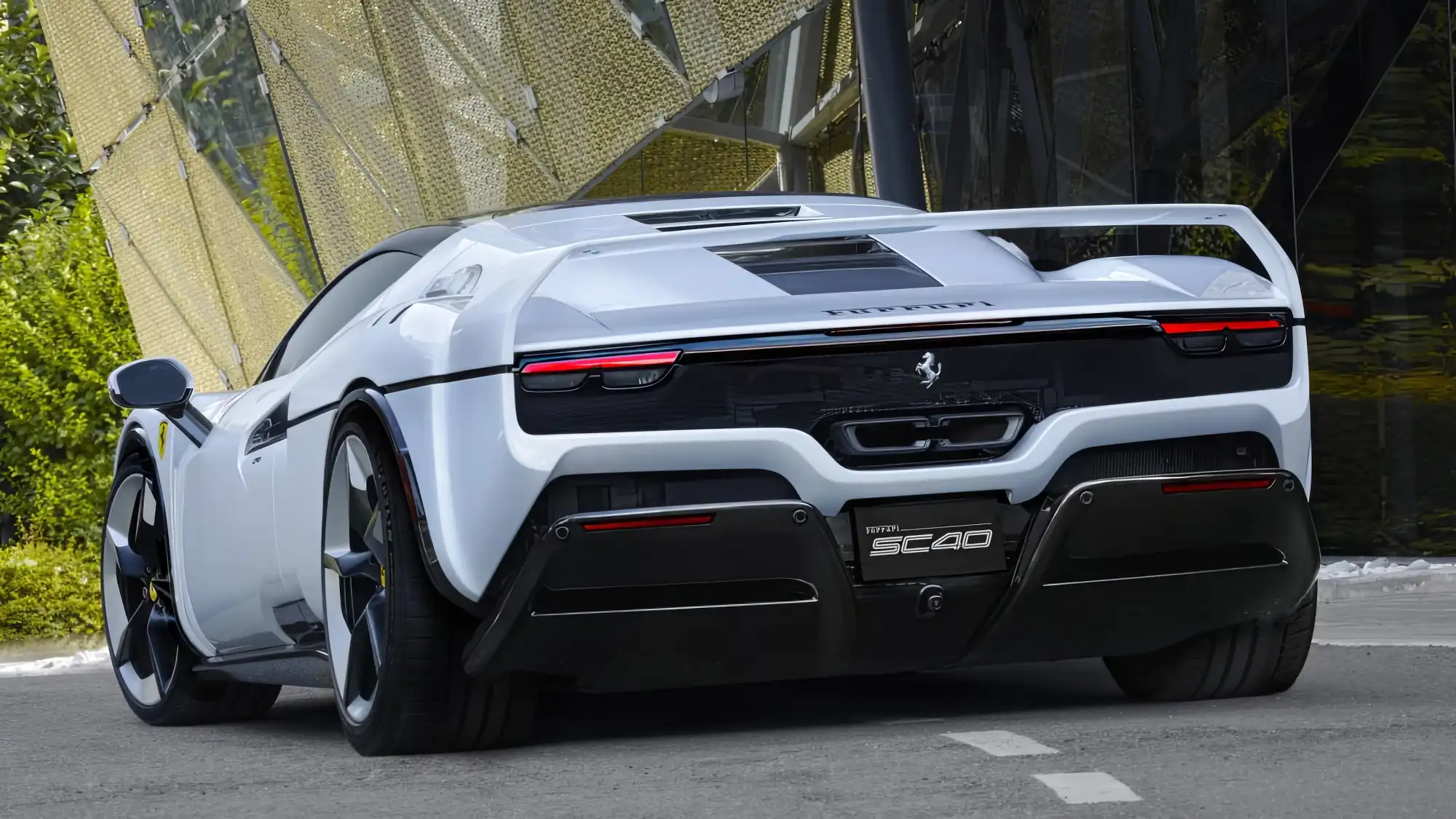 Наиболее заметные изменения касаются кормовой части автомобиля. Здесь расположена объемная угловатая крышка моторного отделения с крупным интегрированным спойлером и мощными вентиляционными отверстиями, аналогичными F40. Логотипы SC40 размещены на кронштейнах заднего крыла. Светодиоды стандартные, однако, как и у предшественника, оснащены декоративной сетчатой рамкой. Центральная выпускная труба была модернизирована, а задний бампер получил новый рисунок диффузора. Специально разработанный для этого проекта кузов окрашен уникальным белым цветом. Внешний облик дополняют индивидуальные двуцветные колесные диски, отличающиеся от классических пятиспицевых дисков F40.