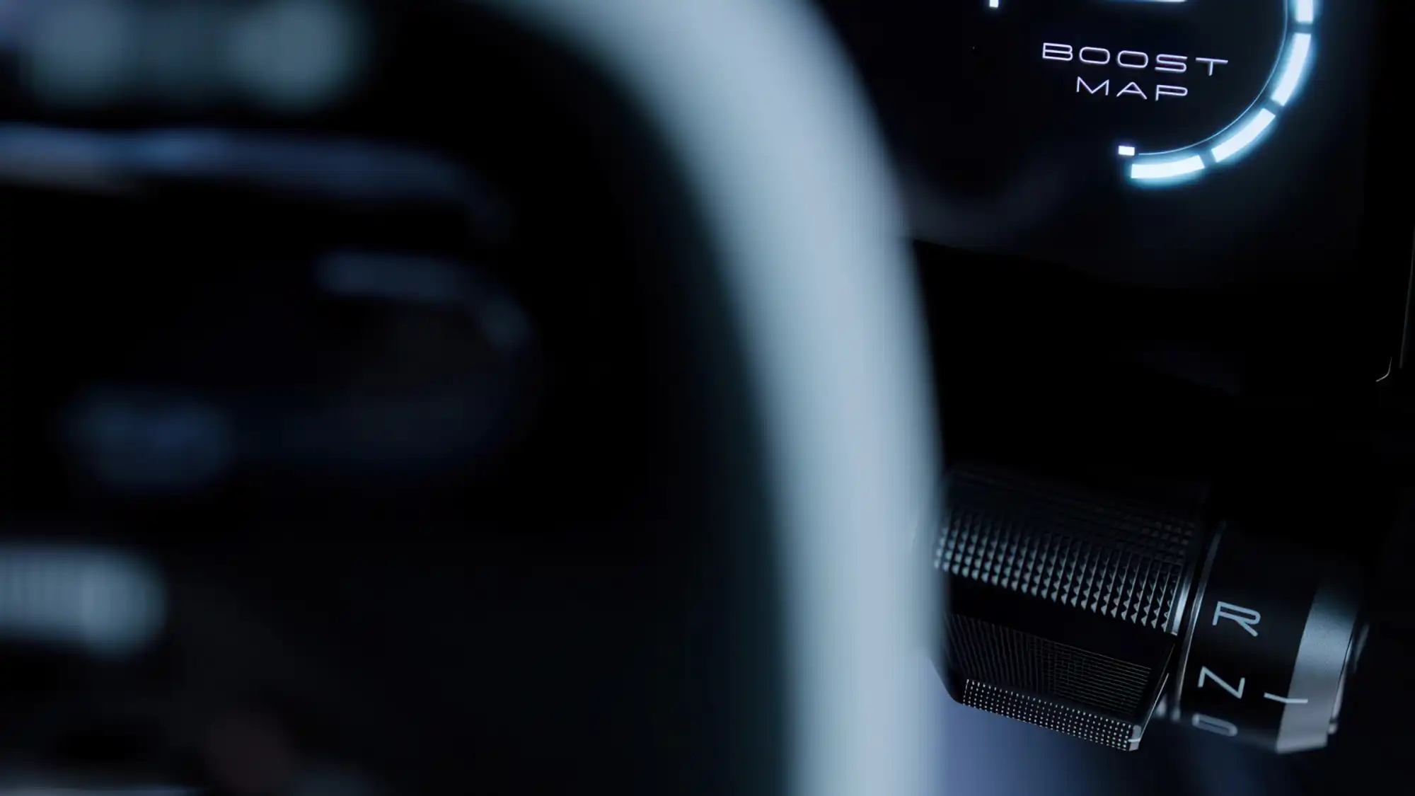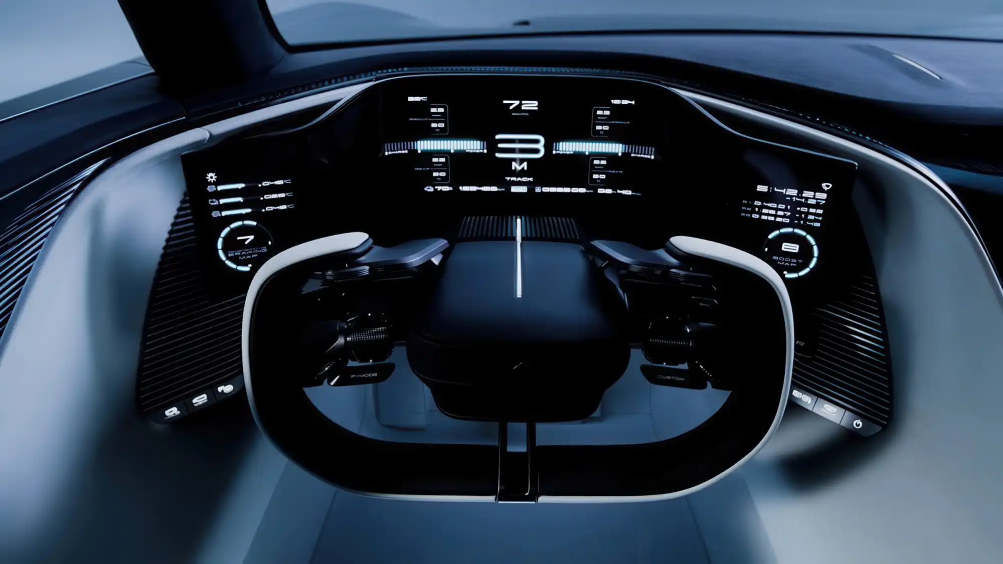 Внутреннее пространство концепта строго двухместное. Весь интерьер спроектирован вокруг водителя по принципу интуитивно понятного управления. Одной из самых интересных особенностей стало рулевое колесо в форме штурвала, которое работает в связке с системой управления по проводам (steer-by-wire). Это решение позволило отказаться от механической связи руля с колесами, что дает возможность программно изменять передаточное отношение в зависимости от режима движения и скорости. Перед водителем расположена минималистичная приборная панель, а все второстепенные функции вынесены на центральный сенсорный интерфейс.