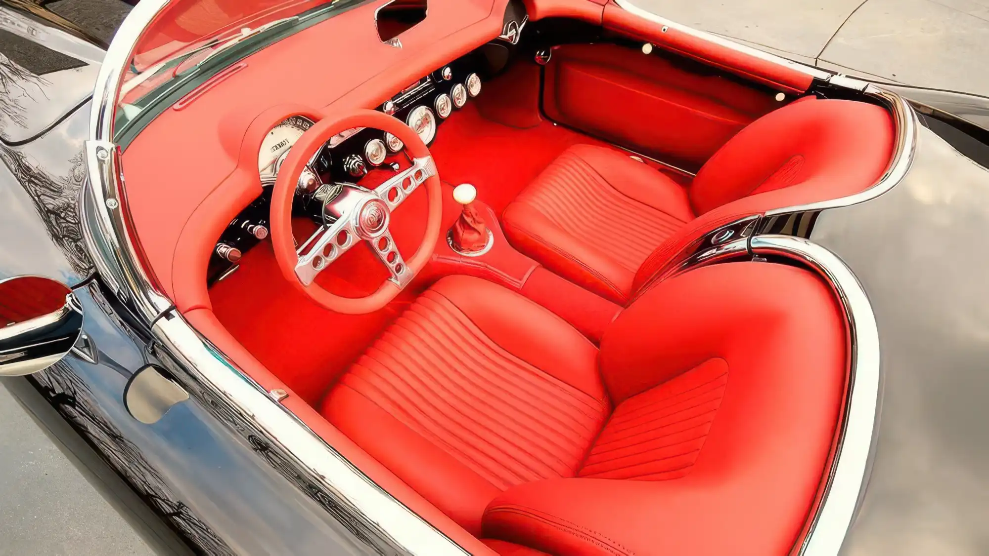 Салон автомобиля был восстановлен с особой тщательностью. Оригинальный заводской комплект приборов был отреставрирован и оставлен на месте, однако отделка была полностью обновлена. Сиденья и панели заново обиты высококачественной ярко-красной кожей. Для повышения комфорта в жаркую погоду в машину интегрировали современную систему кондиционирования Vintage Air. Место стандартного рулевого колеса занял спортивный руль Sparco с уменьшенным диаметром и более толстым ободом для лучшего хвата, что соответствует возросшему динамическому потенциалу автомобиля.