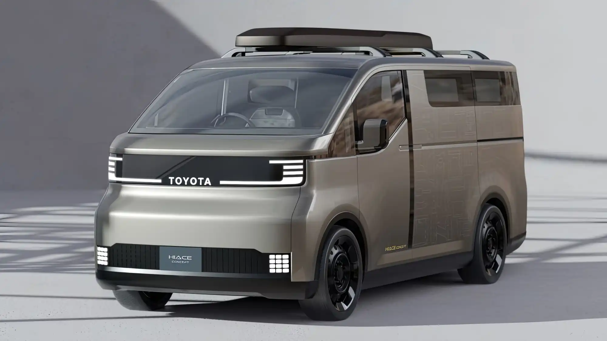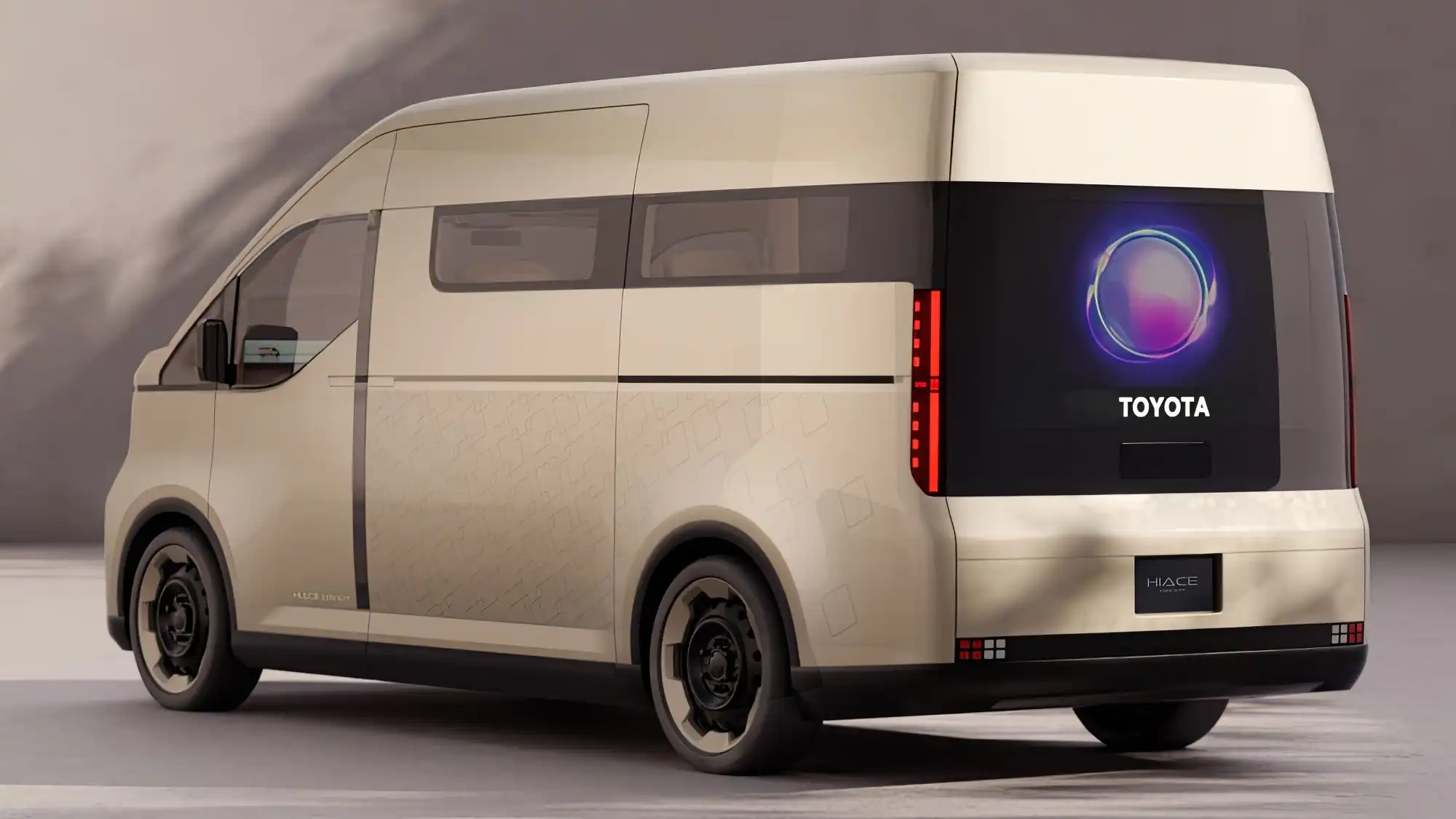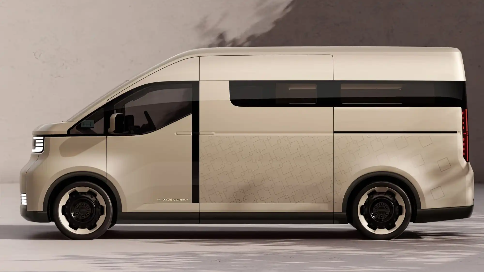 Ещё одна важная премьера — концепт Toyota HiAce, знаковый предшественник новой серии микроавтобусов. Практичный корпус минимизирует размеры моторного отсека, оптимизируя внутренний объем. Отсутствие классической решетки радиатора компенсирует большая черная область с эмблемой Toyota и светодиодными полосами. Передняя часть широко застеклена, а в задней предусмотрена маленькая горизонтальная полоска окна под крышей. Варианты кузова включают удлинённую версию с высокой крышей и огромным экраном на двери багажника.