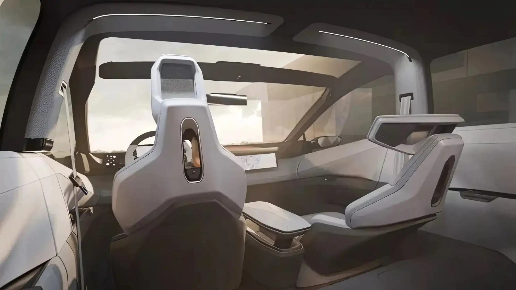 Передние крылья оснащены отверстиями, видимо предназначенными для зарядки. Дверные ручки традиционные, стекла широкие, стойки и крышка багажника украшены черным цветом. Колеса имеют необычный рисунок. Внутри концепта две большие панели замещают центральный монитор. Над головой водителя расположены маленькие экраны для климатических настроек и мультимедиа. Перед пассажирским креслом находится отдельный дисплей для развлечений. Селектор коробки передач помещен на выступающую консоль, декорированную изображением автомобиля.