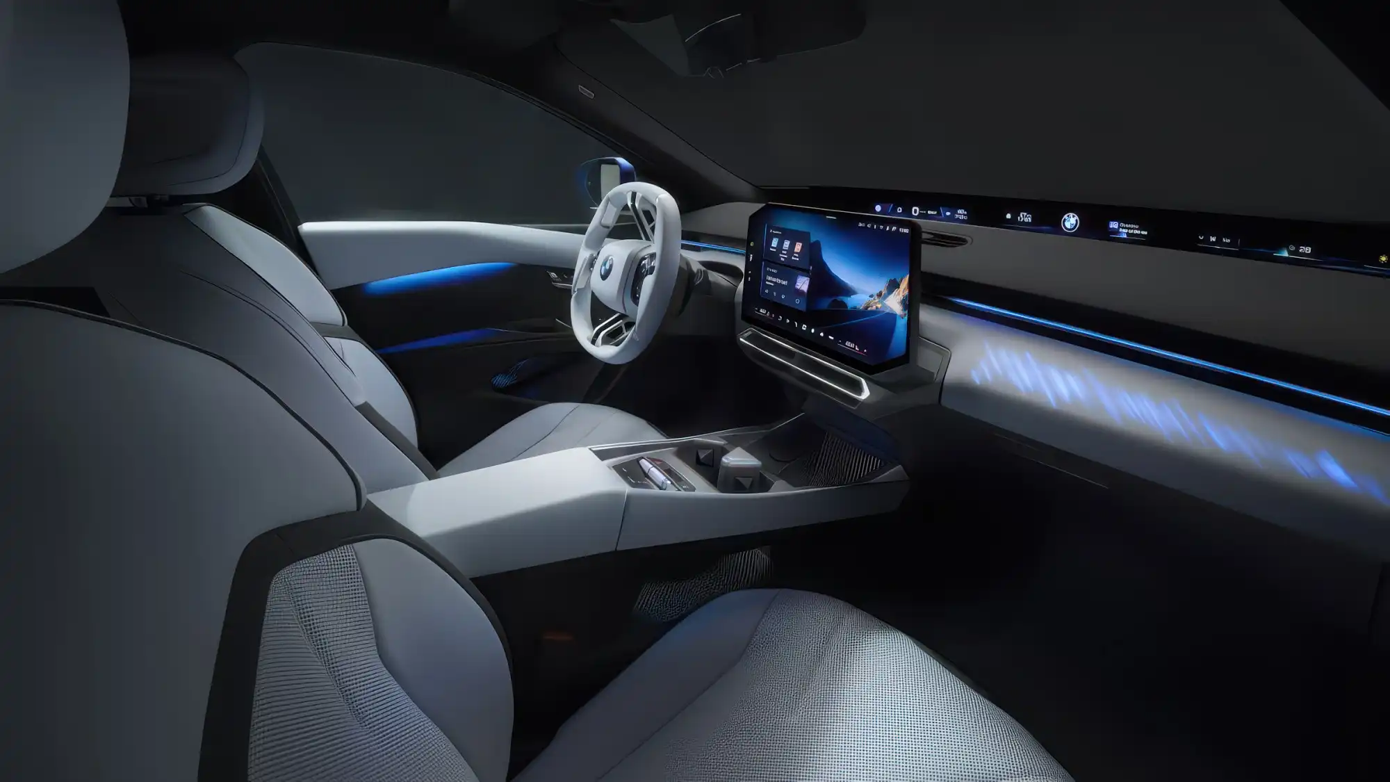 Салон BMW i3 полностью лишен традиционных физических кнопок на передней панели. Главным технологическим новшеством стала система BMW Panoramic Vision — проекционный дисплей во всю ширину лобового стекла в его нижней части. Информация выводится непосредственно в поле зрения водителя и переднего пассажира. Управление осуществляется через компактный центральный тачскрин и многофункциональные сенсорные зоны на рулевом колесе с тактильной отдачей. В отделке широко используются материалы из вторсырья и текстиль вместо натуральной кожи, что подчеркивает экологическую направленность модели.