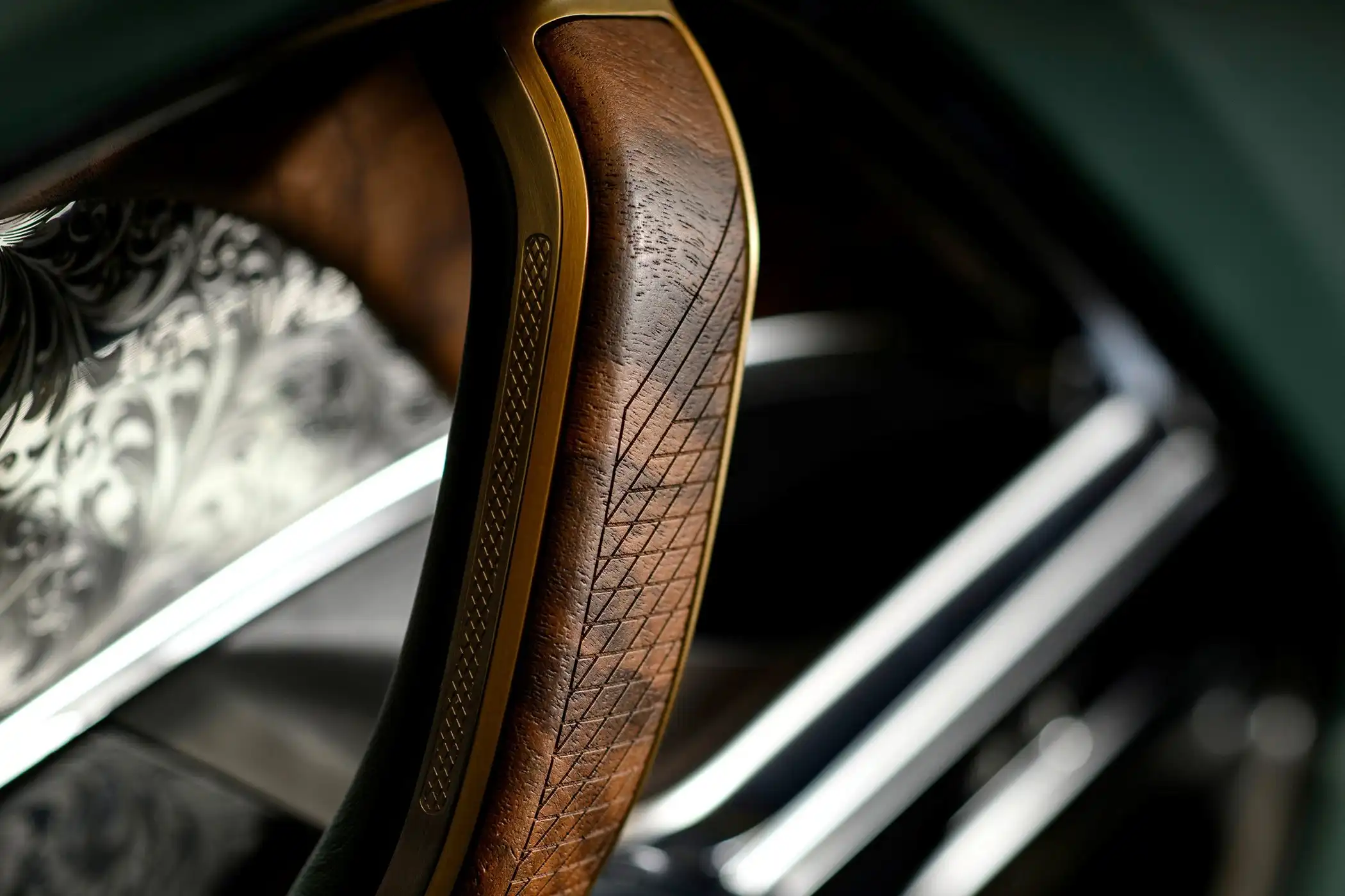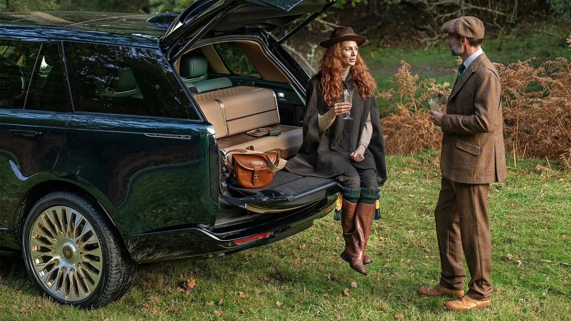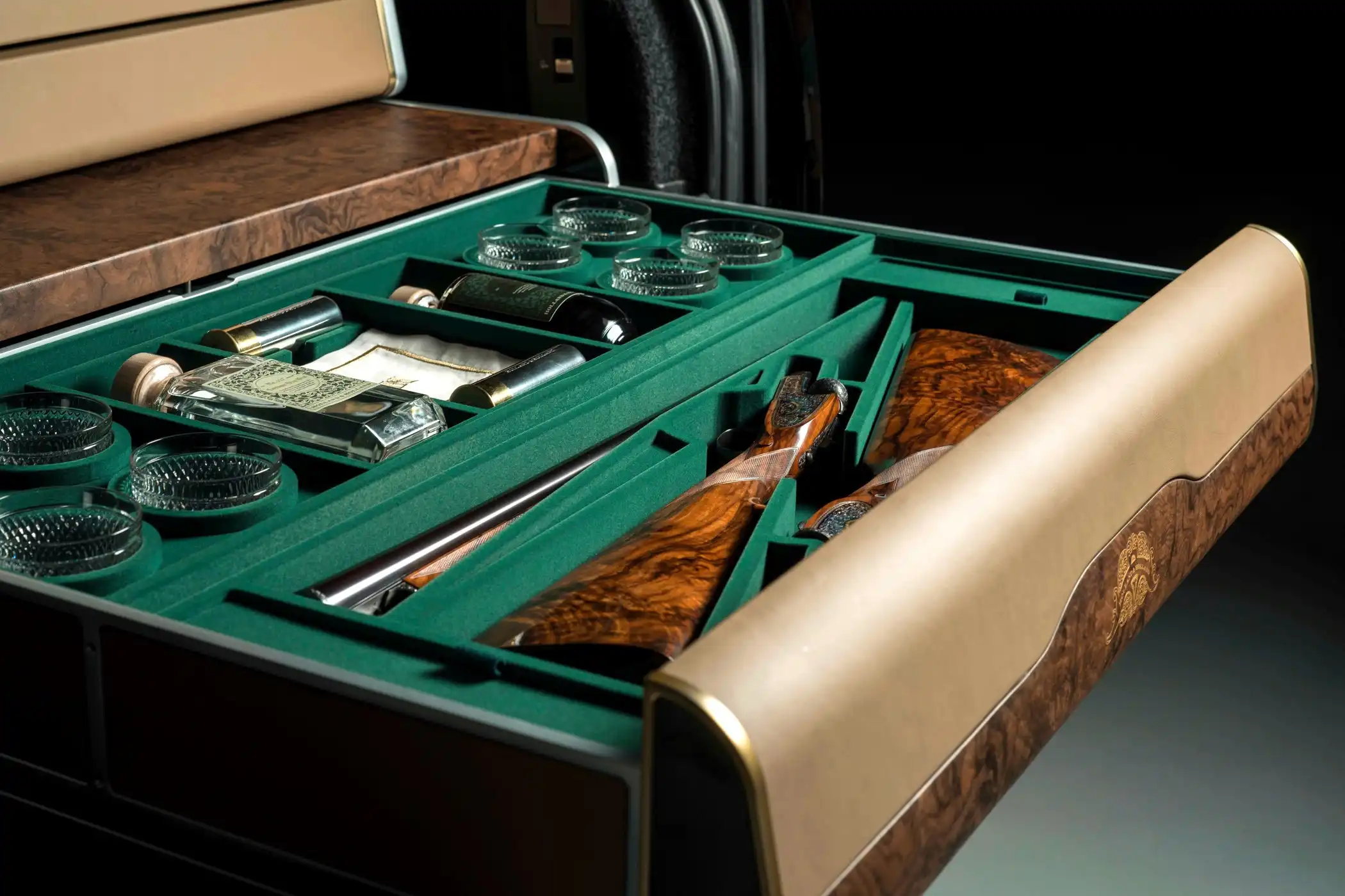 Особое внимание уделено оснащению багажного отделения. Здесь расположены два уникальных деревянных ящика ручной работы, выполненных из ценных пород древесины и высококачественной кожи. Верхняя секция оборудована набором для дегустации шампанского на восьмерых гостей, включающим хрустальные бокалы, оригинальный штопор из оленьего рога и специальную тканевую салфетку с оригинальной вышивкой. Нижняя секция предназначена для перевозки пары элегантных двуствольных ружей производства Holland & Holland, а также набора для употребления виски с восемью стаканчиками, стеклянным графином и двумя флягами, выполненными в форме охотничьих пуль.