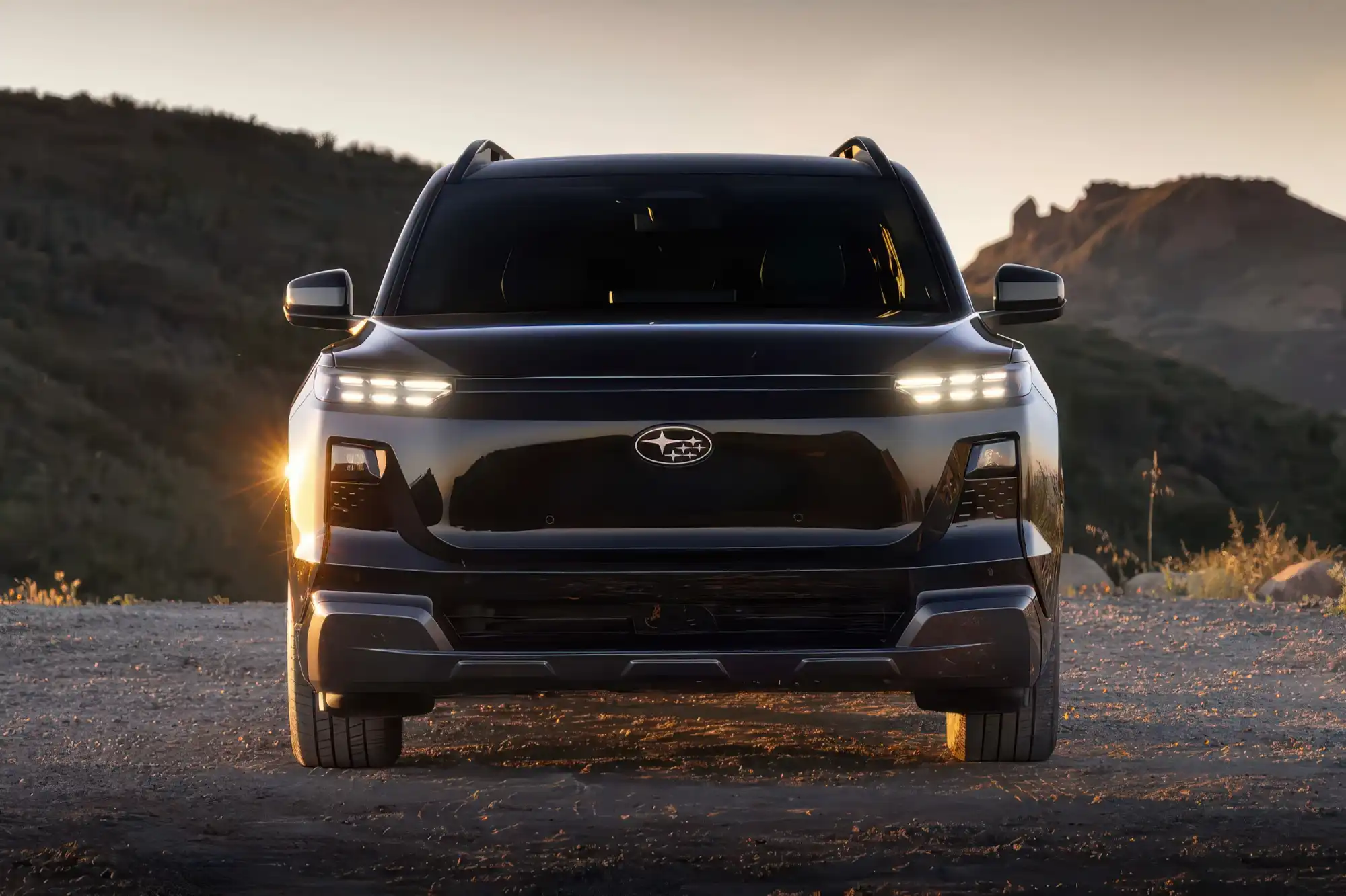 Новинка вновь не претендует на оригинальность, так как прообразом послужил представленный в феврале электрический кроссовер TOYOTA HIGHLANDER пятого поколения, от которого SUBARU GETAWAY унаследовал пятиметровый кузов с массивными квадратными арками, рельефными выштамповками на боковинах и выдвижными дверными ручками. Дизайн передней и задней частей кузова у SUBARU оригинальный: применены раздельные блоки ходовых огней с индикацией уровня заряда, иной передний бампер с трапециевидными фарами, а также глухая панель с подсвеченным логотипом вместо решетки радиатора.