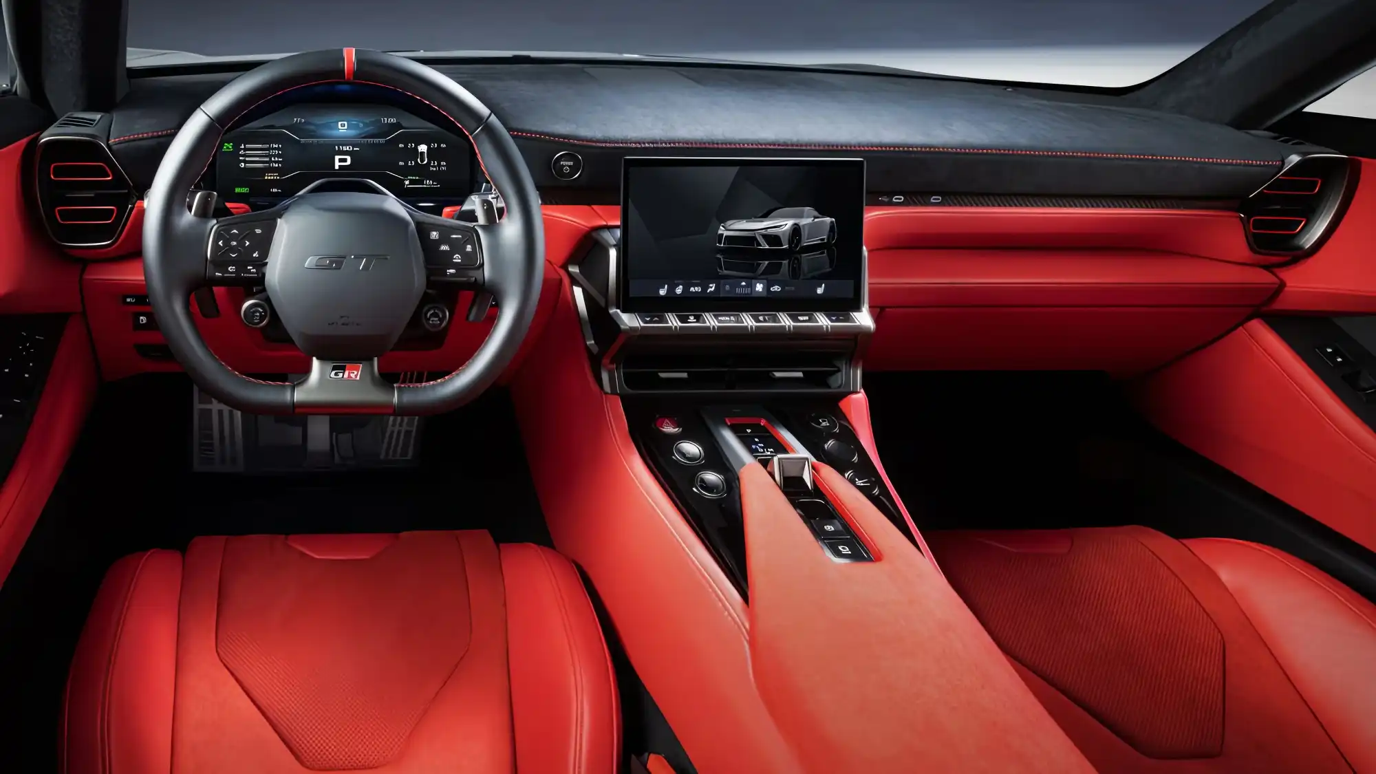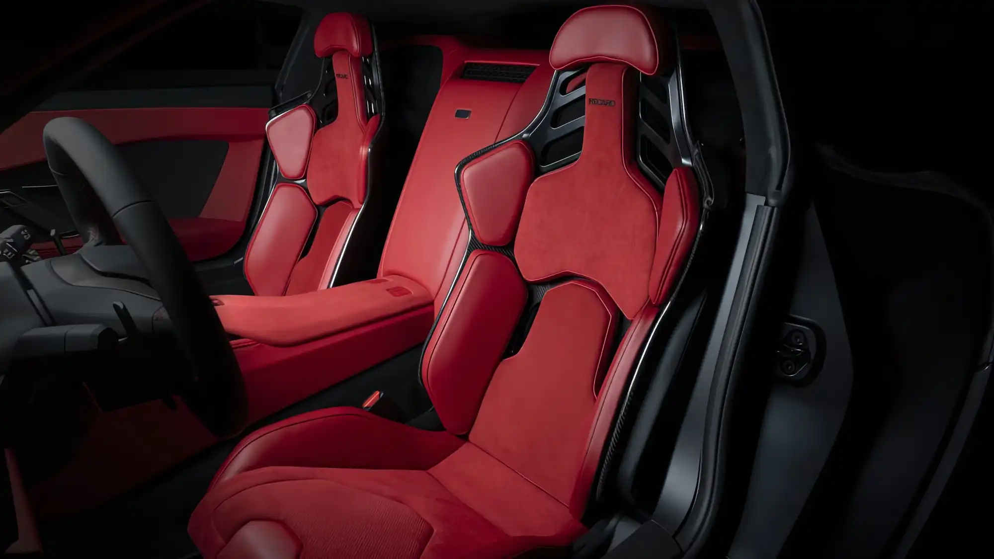 Салон суперкара строго двухместный и спроектирован вокруг водителя. Кресло установлено максимально низко, на уровне центра тяжести автомобиля, что должно обеспечить идеальное «чувство машины». Эргономика ориентирована на гоночные условия, но при этом обеспечивает комфорт для повседневной эксплуатации. На передней панели расположены информативный дисплей приборов и центральный планшет медиасистемы. Для удобства управления климатом и основными функциями сохранены крупные физические клавиши и переключатели на центральном тоннеле.