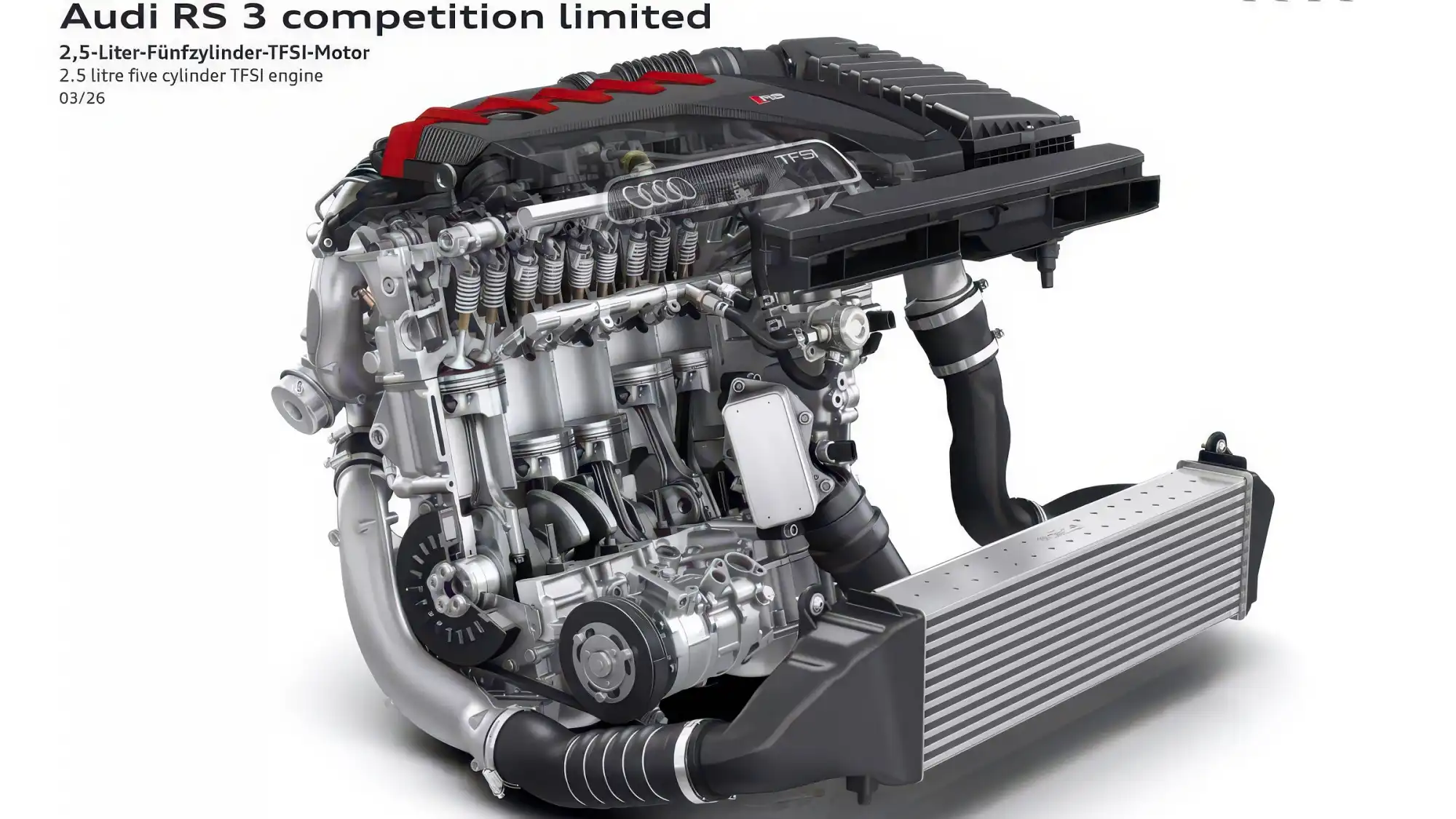 Под капотом AUDI RS 3 PERFORMANCE EDITION установлен модернизированный турбомотор 2.5 TFSI с характерным порядком работы цилиндров 1-2-4-5-3.