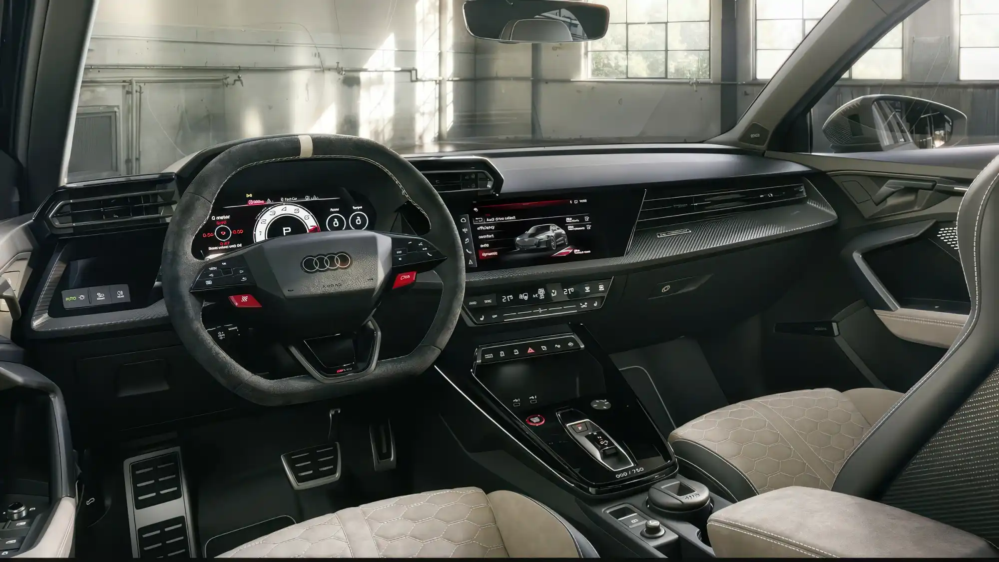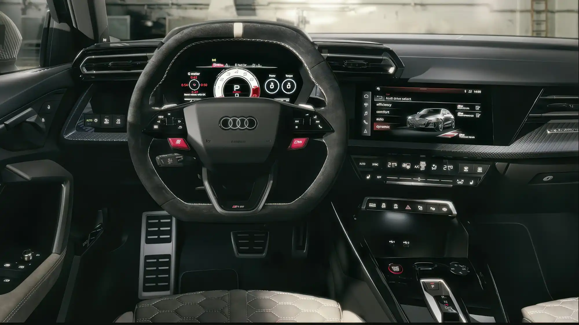 Информационно-развлекательная система MMI дополнена специальным разделом RS MONITOR. Он позволяет водителю в реальном времени отслеживать температуру охлаждающей жидкости, моторного и трансмиссионного масла, давление в шинах, а также перегрузки G-FORCE. На 12,3-дюймовый цифровой кокпит можно вывести индикатор переключения передач в стиле гоночных болидов, который меняет цвет от зеленого до мигающего красного при достижении оптимальных оборотов.